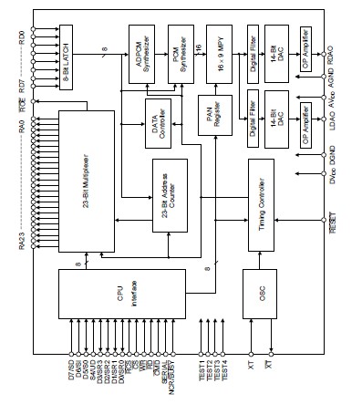 MSM9810B features: (1)Non-linear 8-bit PCM/straight 8-bit PCM/4-bit ADPCM/4-bit ADPCM2; (2)Serial input or parallel input selectable; (3)Phrase Control Table function; (4)8-channel mixing function; (5)Master clock frequency: 4.096 MHz; (6)Sampling frequency: 4.0 kHz, 5.3 kHz, 6.4 kHz, 8.0 kHz, 10.6kHz, 12.8 kHz, 16.0 kHz, 21.2 kHz, 25.6 kHz, 32.0 kHz; (7)Maximum number of phrases: 256; (8)Output channel: L/R 2 channels; (9)Built-in volume control function (for each output channel); (10)Built-in 14-bit D/A converter; (11)Built-in low-pass filter: Digital filter; (12)Package: 64-pin plastic QFP (QFP64-P-1414-0.80-BK) (MSM9810BGS-BK).
