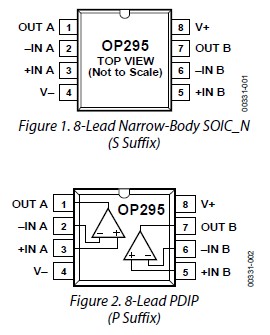 OP295G absolute maximum ratings: (1)Supply Voltage: ±18 V; (2)Input Voltage: ±18 V; (3)Differential Input Voltage: +36 V; (4)Output Short-Circuit Duration: Indefinite; (5)Storage Temperature Range P, S Package: –65℃ to +150℃; (6)Operating Temperature Range: –40℃ to +125℃; (7)Junction Temperature Range, P, S Package: –65℃ to +150℃; (8)Lead Temperature Range (Soldering, 60 Sec): +300℃.